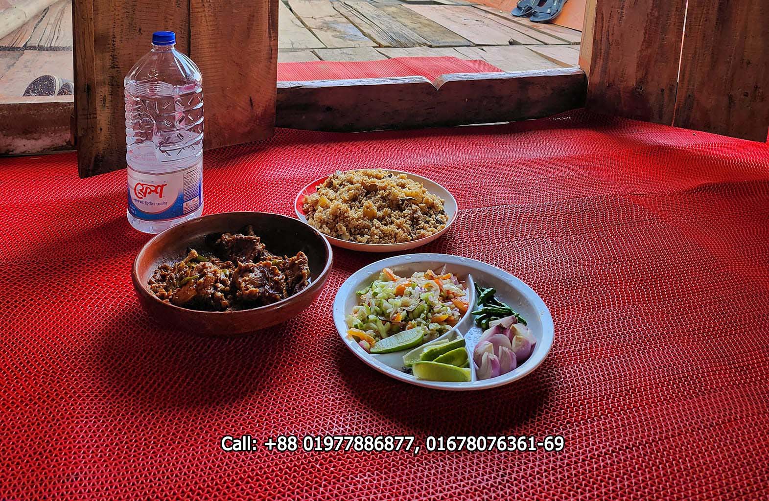 Lunch (2:00 PM) – Plain Rice, Bhorta, Vegetable, Local Chicken Bhuna, Local Fish Bhuna, Ghono Dal, Salad & water.