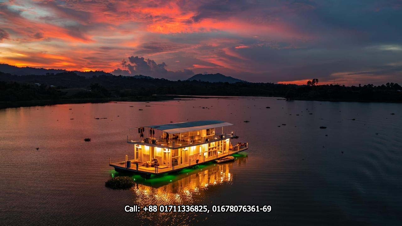 Mayaleen Floating Villa at Kaptai. The Mayaleen Floating Villa offers a serene retreat on the tranquil waters of Kaptai Lake. With its picturesque setting amidst lush greenery and pristine waters, guests can indulge in ultimate relaxation and luxury. The villa boasts modern amenities, stunning views, and the unique experience of staying afloat in nature’s embrace.