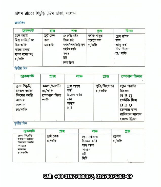 Dinner (Night Stay): 9.00 P.M- Pollow+ Shirmp Vuna+ Vetki Fish Dopeaga+ Chicken Roast+ Salad+ Sweet Curt