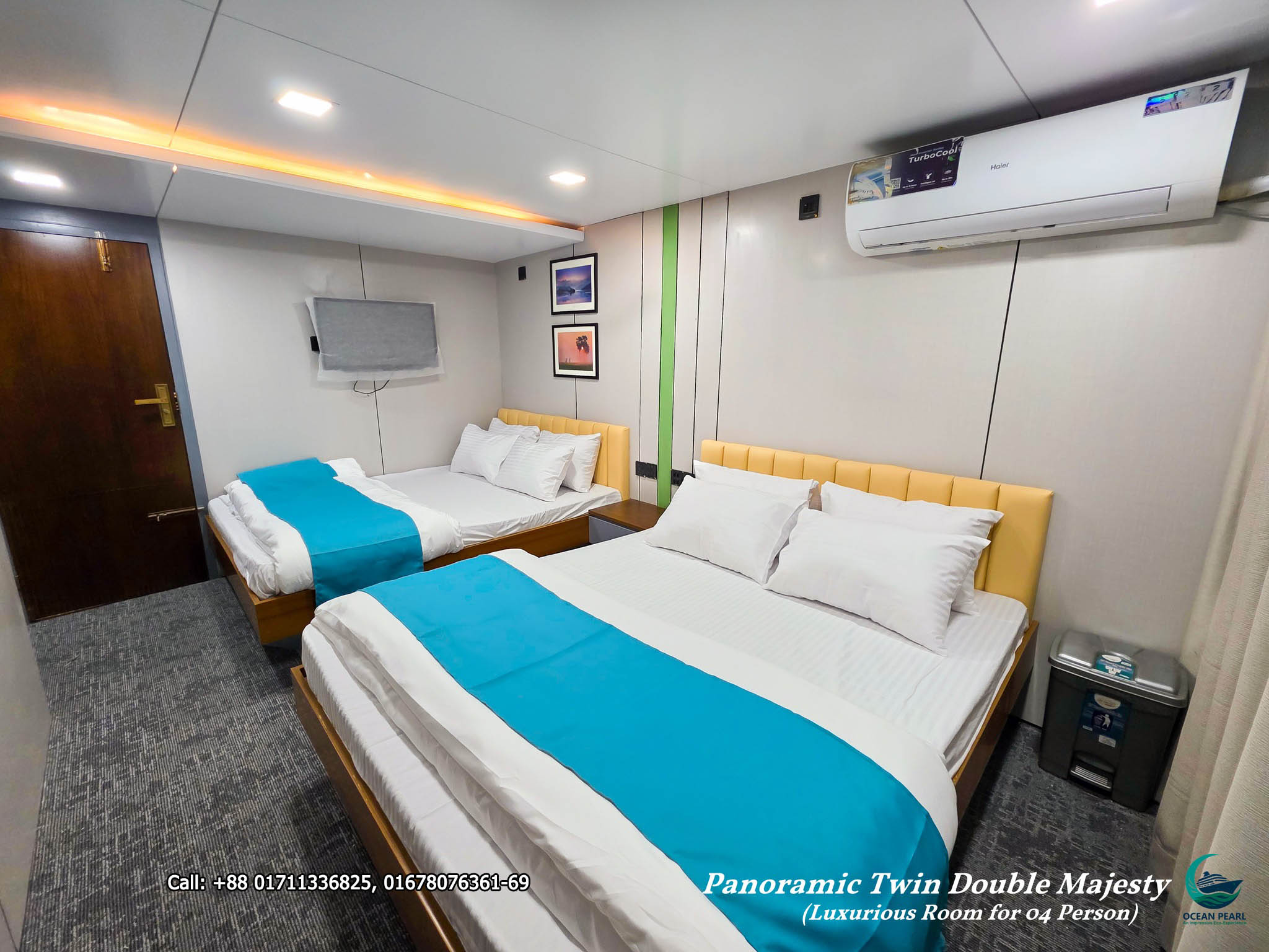 ০৪ জনের (২ কাপল বেড) জন্য আমাদের সবচাইতে স্পেশাল রুম, যার সাথে রয়েছে দ্বিতীয় তলার আলাদা ওপেন ফ্রন্টডেক এবং রুম থেকে ১৮০° প্যানোরামিক ভিউ।