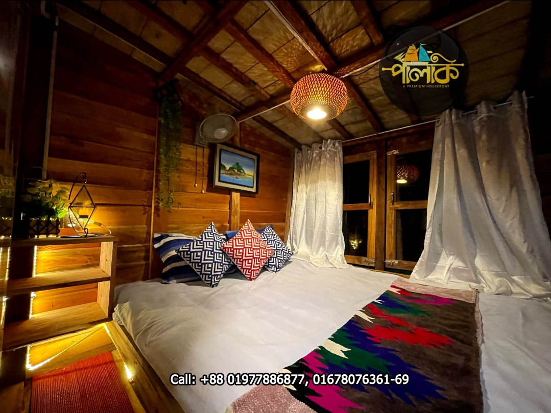 টাংগুয়ার হাওরে ভ্রমণ করুন হাওরের বড় ও নান্দনিক ইন্টেরিয়র ডিজাইন প্রিমিয়াম হাউজবোটে। সম্পূর্ণ কাঠের তৈরি পালকি।