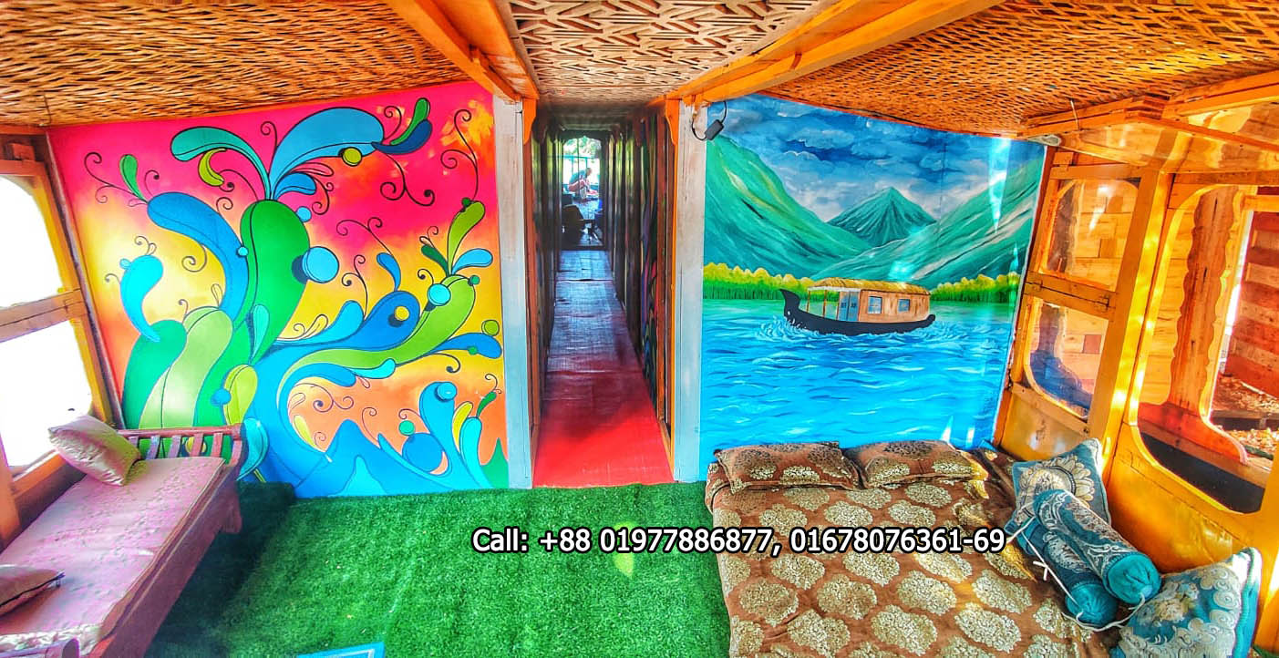 ❑ আমাদের পুরো হাউসবোট যেন একটি ক্যানভাস প্রতিটি দেয়াল চিত্রকর এর নিজ হাতে করা চিত্র শিল্প বিদ্যমান।