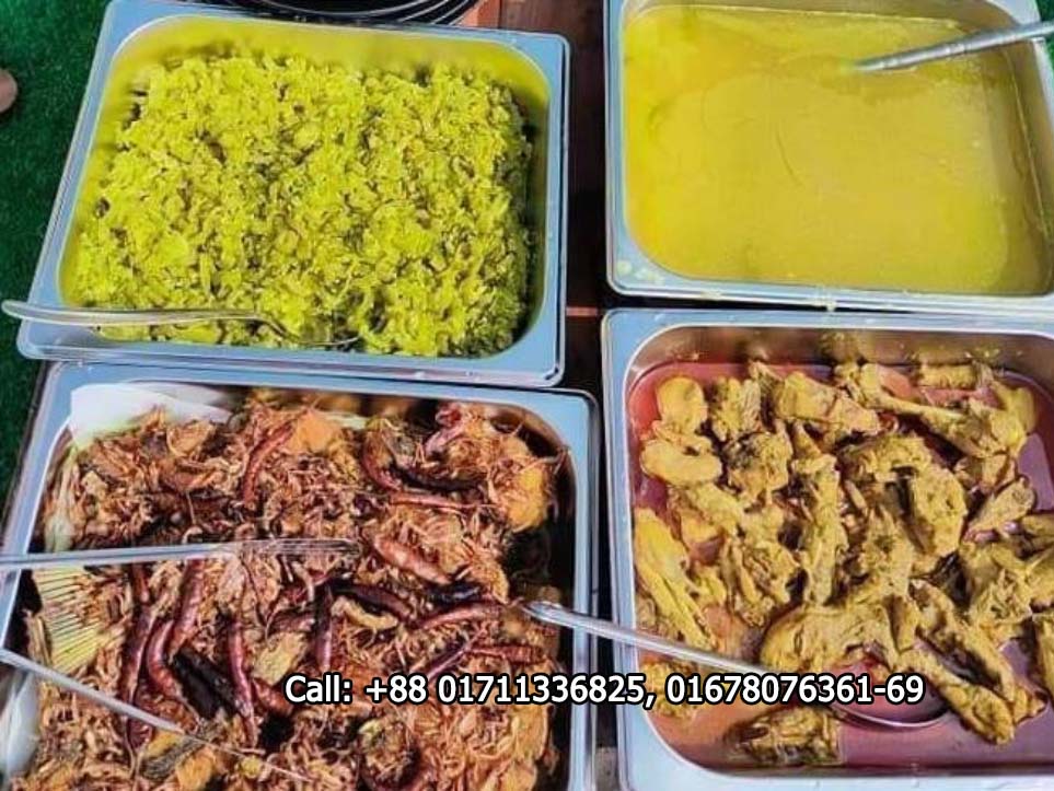 Lunch (2:00 PM) – Plain Rice, Bhorta, Vegetable, Local Chicken Bhuna, Local Fish Bhuna, Ghono Dal, Salad & water.